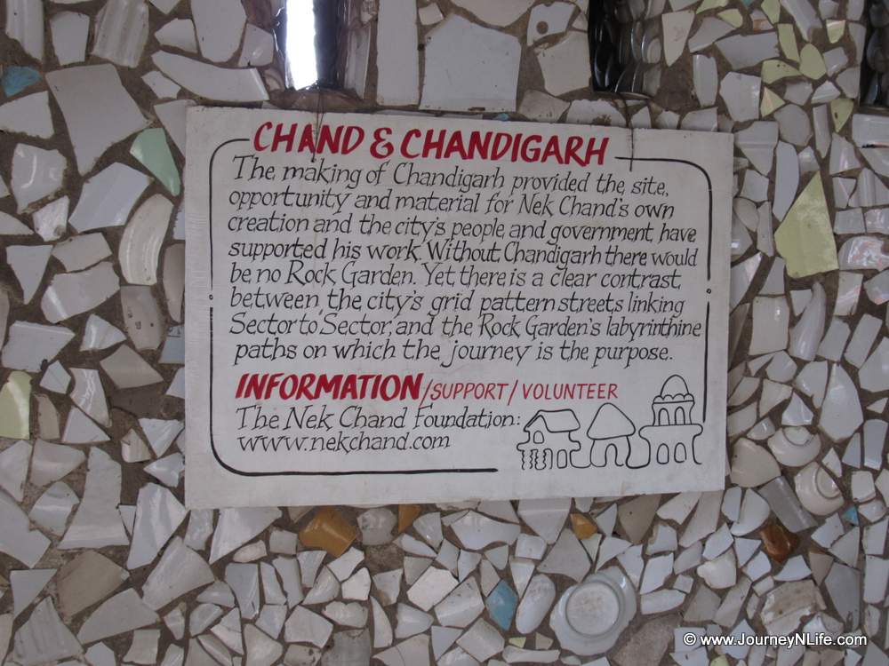 This garden is a best example of using the recycled materials such as broken pots, old bricks, glass, bottles, electrical waste, tiles and many more in a beautiful way and this was one of the main moto of Nek Chand. Also Nek Chand was awarded the Padam Shri award by the Prime Minister of India in 1984 for his beautiful work with waste.